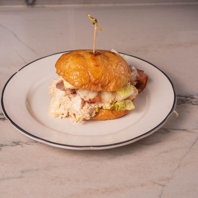 Seasonal Special: House made chicken salad with bacon, lettuce, Sunday sauce and melted Swiss cheese on a toasted Poupart croissant.