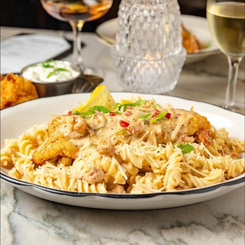 Crawfish pasta topped with a fried catfish filet.