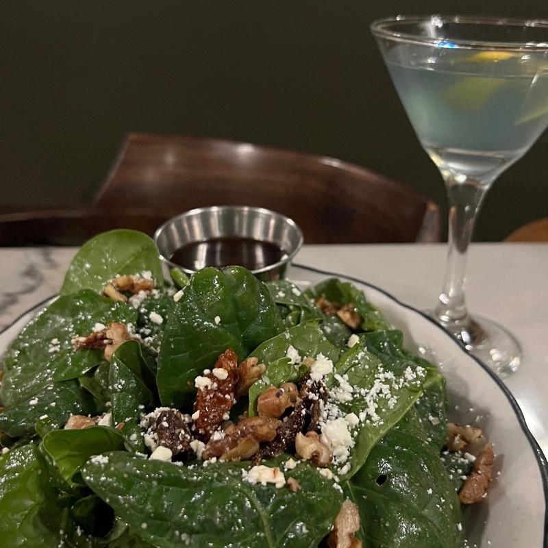 Fresh spinach & pepper jelly vinaigrette tossed with feta cheese, sundried tomatoes & toasted walnuts • Add Chicken | Shrimp