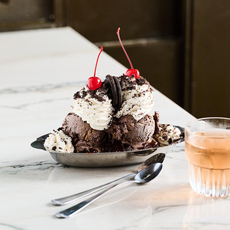 Hot fudge brownie, topped with 2 scoops of road trip ice cream, crushed Oreos, whipped cream & cherries on top...oh, my stars!