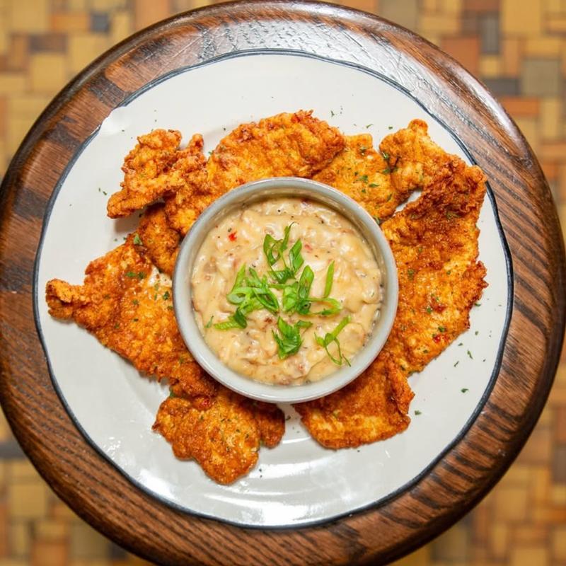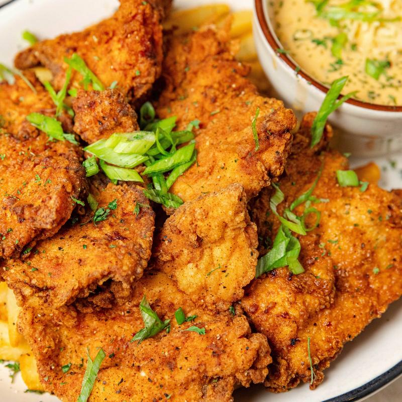 Fresh hand sliced & marinated chicken breast fillets, battered and fried to order, served with a side of white sausage gravy • Add Fries | Add Side Crawfish Sauce