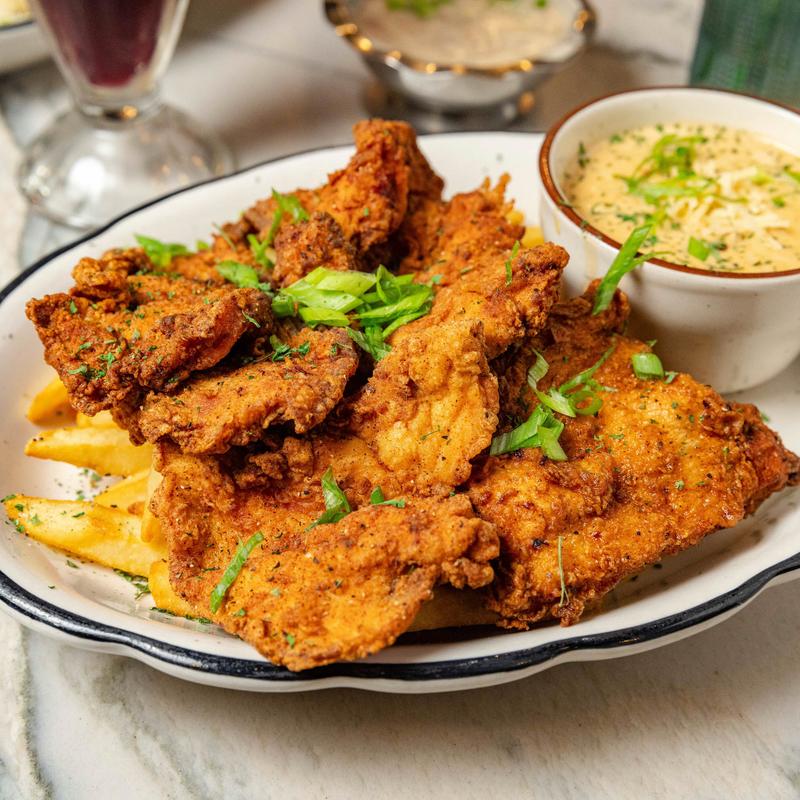Hand sliced & marinated fried chicken fillets, seasoned fries and a side of our creamy house made Louisiana crawfish sauce.