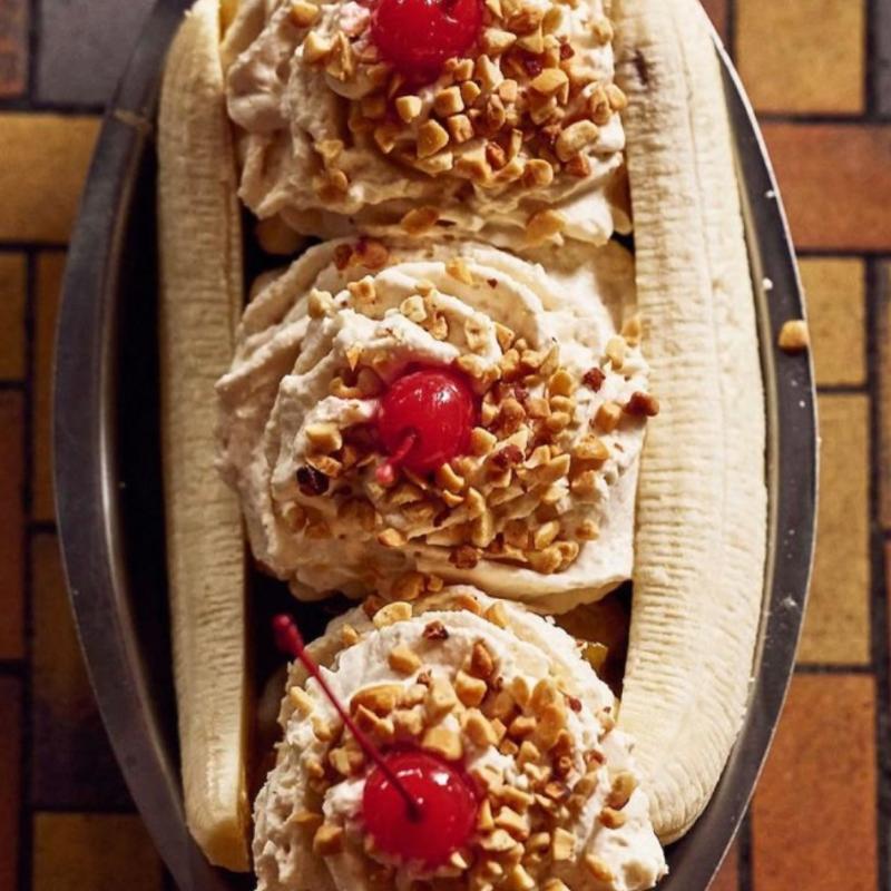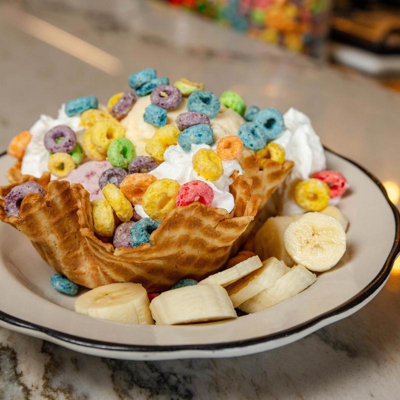 Vanilla, strawberry & chocolate ice cream topped with chocolate syrup, house made berry and pineapple compote, peanuts, whipped cream, cherries on top & rainbow sprinkles ain't that a doozy!