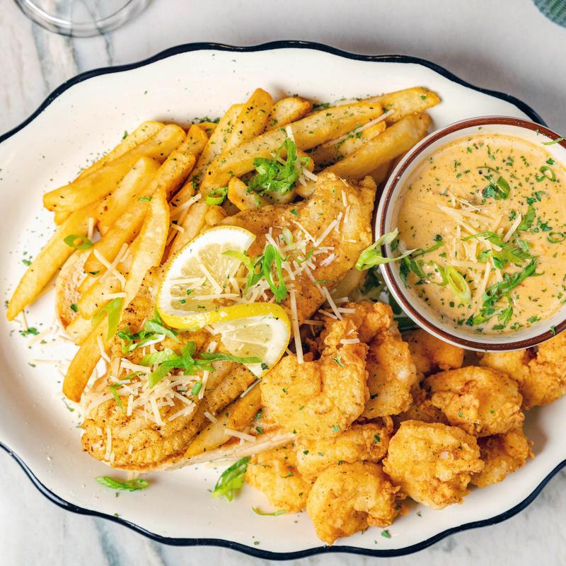 Fried local catfish fillet, fried gulf shrimp & seasoned fries, with a side of our creamy house made Louisiana crawfish sauce.