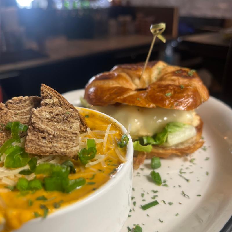 house made chicken salad with melted Swiss & bacon on a toasted croissant dressed with lettuce & Sunday sauce. Served with a side of tomato bisque